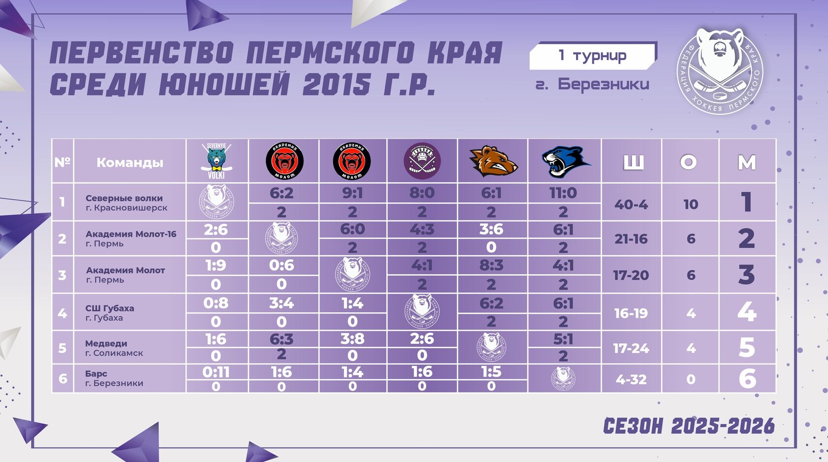 Распределение команд по итогам первого турнира Первенства Пермского края среди юношей 2015 г.р., прошедшего в г. Березники