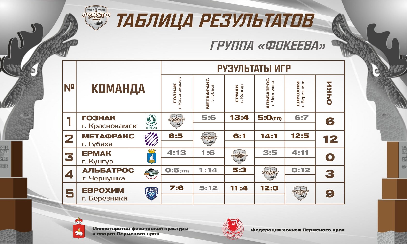 📌 Лидером группы на данный момент выступает «Метафракс» г. Губаха, выиграв все 4 матча первой половины квалификационного этапа, чуть ниже идет новичок Первенства - «Еврохим» из Березников, на 3 месте располагается Краснокамский «Гознак» - обладатель «Кубка Силы» прошлого сезона, на 4-м и 5-м месте расположились «Альбатрос» и «Ермак», которые всеми силами пытаются поправить непростую для себя ситуацию.