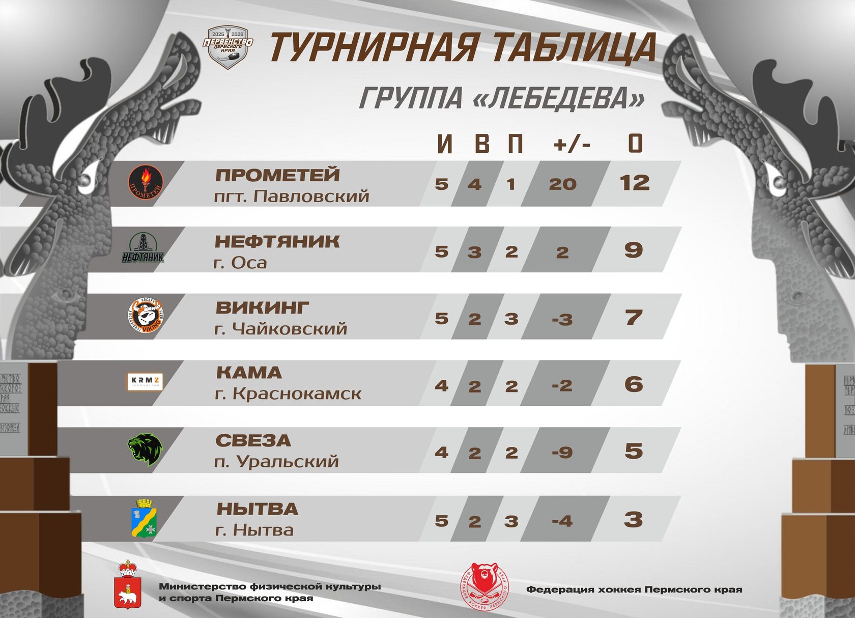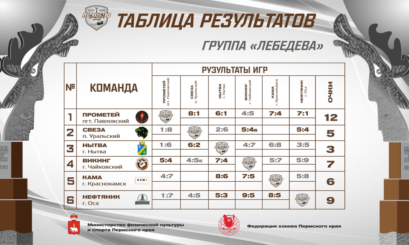 📌 Лидером группы на данный момент является «Прометей» из п. Павловский, который начал этот сезон с победной серией в 4 матча. «Нефтяник» из Осы идет на хорошем ходу и заканчивает 1 половину сезона с 9 очками. «Викинги» и «Кама» располагаются на данный момент на 3 и 4 месте, и отрыв между двумя командами составляет лишь одно очко, что обозначает упорную борьбу между этими командами. «Свеза» и «Нытва» хоть и не попадают в зону плей-офф, но каждый матч стараются зацепиться за победу, но пока что обеим командам из Нытвенского округа в некоторых моментах чего-то просто на просто хватает.