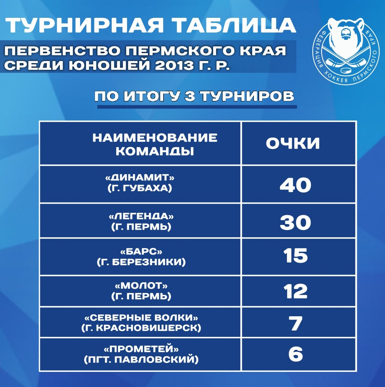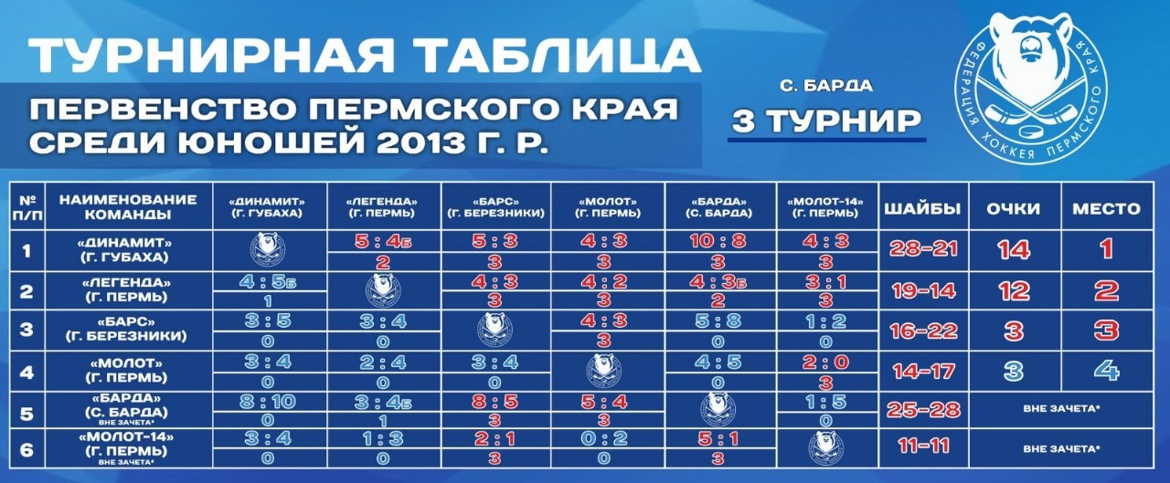 Турнирная таблица 3 турнира, прошедшего в с. Барда и результаты по итогам всех турниров Первенства Пермского края среди юношей 2013 г.р. 🥅🏒