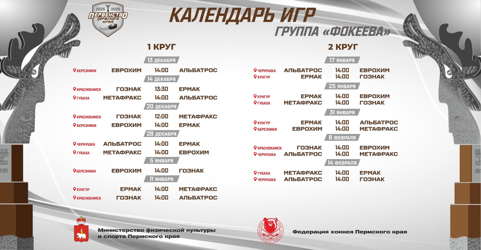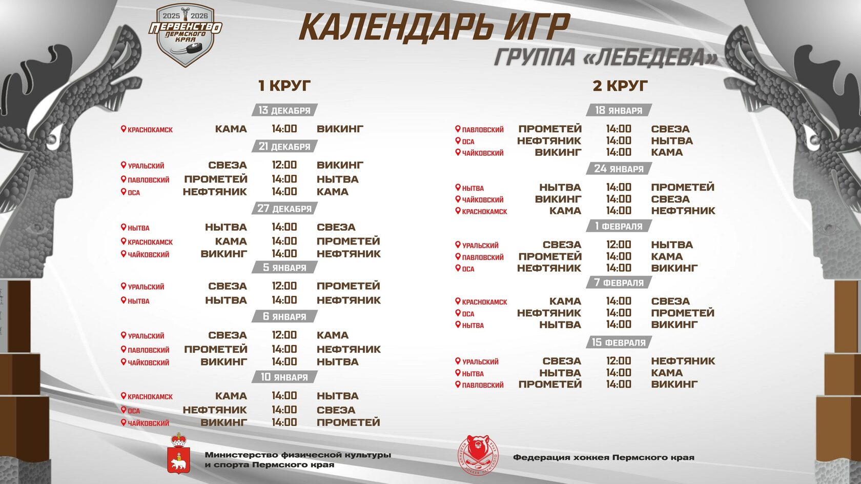Первый матч Первенства Пермского края пройдет 13 декабря в городе Краснокамск между командами «Кама», г. Краснокамск и «Викинг», г. Чайковский