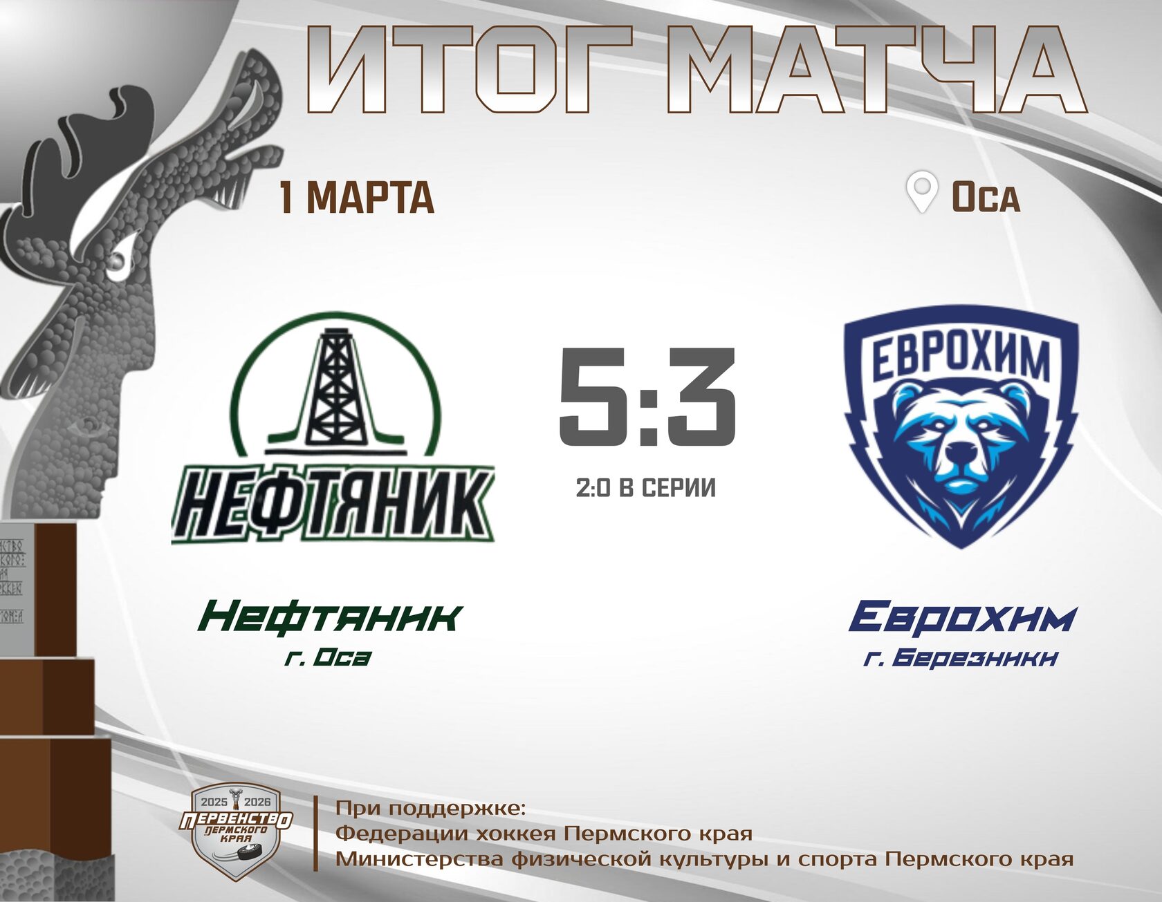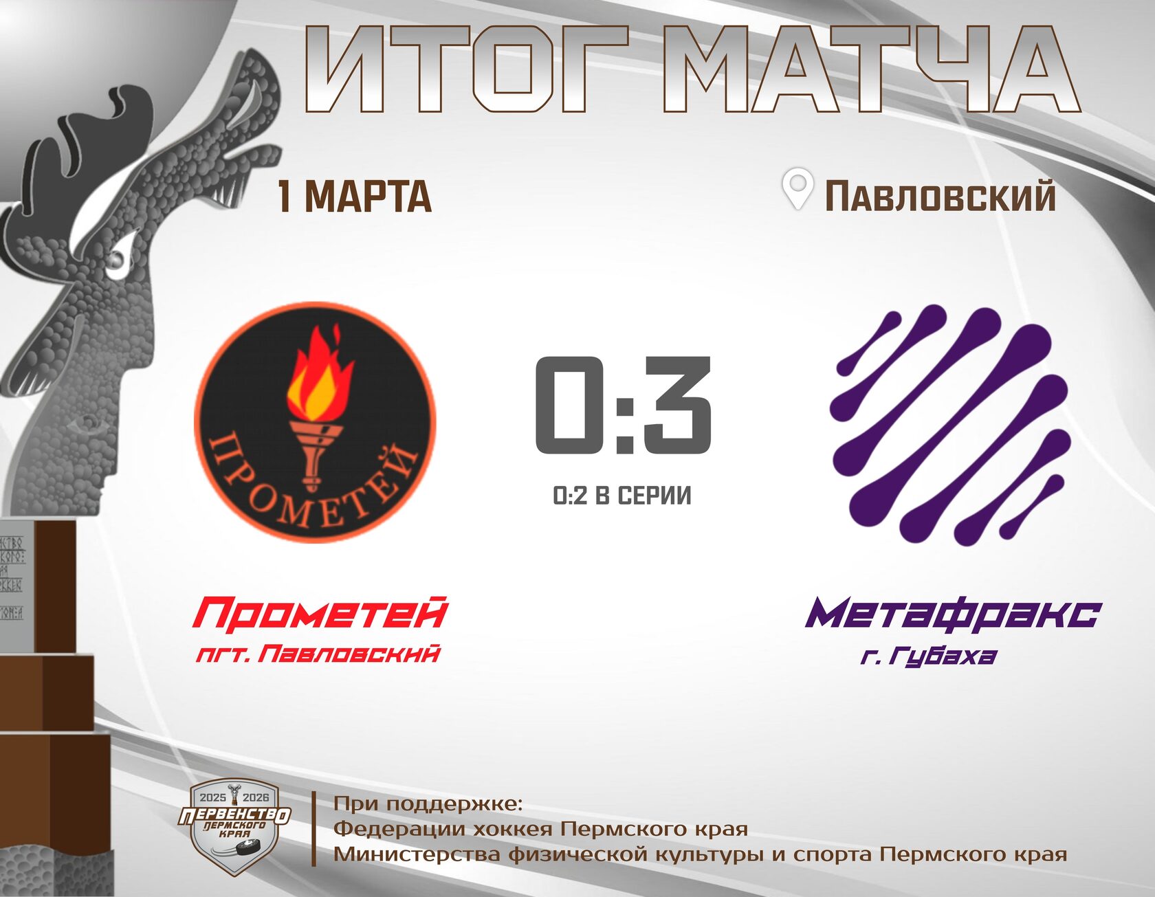В матче за бронзовые медали встретятся "Еврохим" г. Березники и "Прометей" п. Павловский, которые не смогли одержать побед в полуфинальных сериях.