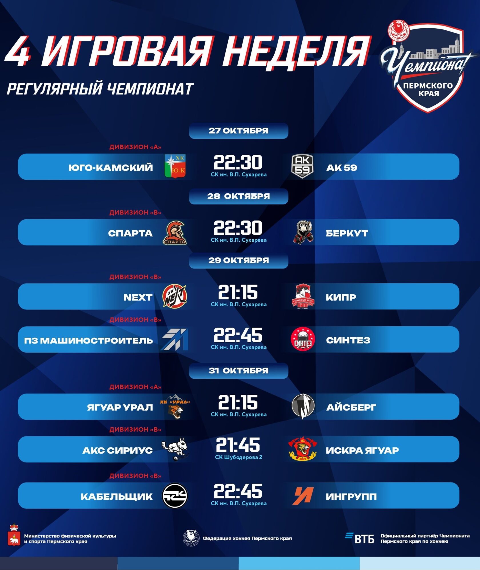 Следите за расписанием матчей и заряжайтесь на новую 4 игровую неделю Чемпионата Пермского края!🔥