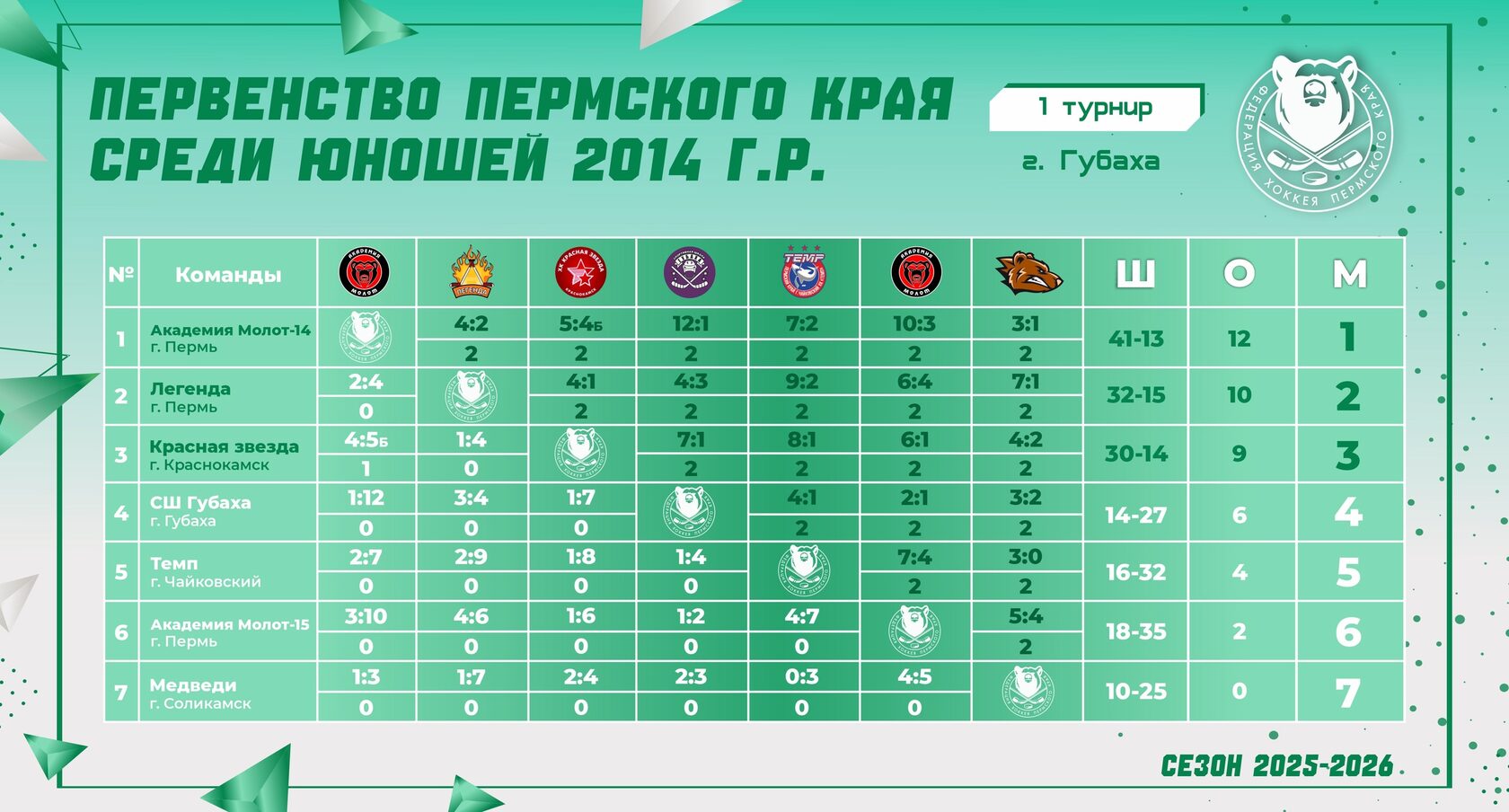 Распределение команд по итогам первого турнира Первенства Пермского края среди юношей 2014 г.р., прошедшего в г. Губаха с 19 по 21 сентября 🏒🥅